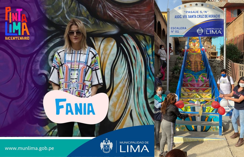 Fania worked with the Municipality of Lima on various public and community art projects. She took part in the intervention of urban staircases in the settlements of Lima Este through the “Pinta Lima Bicentenario” project, an initiative that aimed to transform spaces through art and cultural identity.
